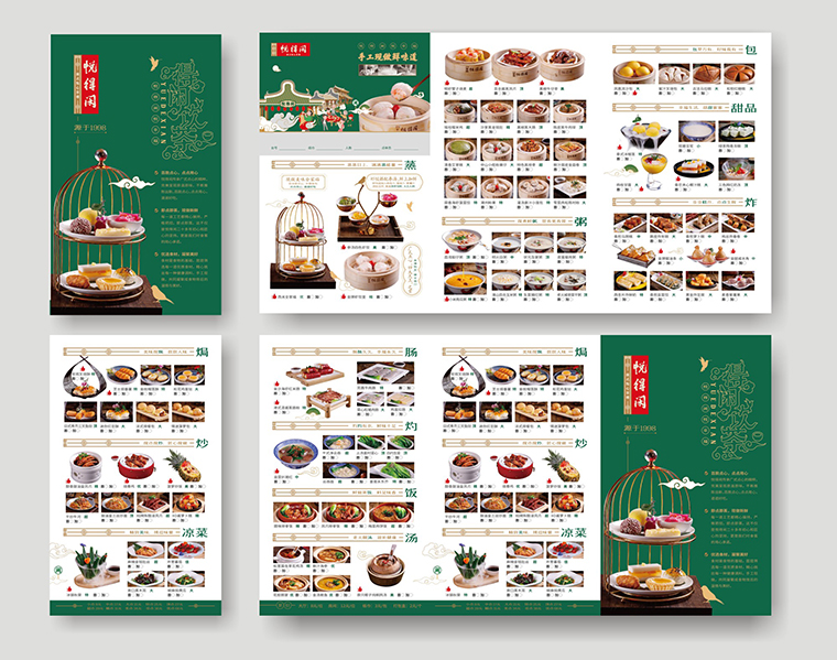 不同的點(diǎn)心茶樓,品牌特性不同,產(chǎn)品數(shù)量也不同,定位人群也略有差異,版式編排及文案風(fēng)格都會(huì)有所不同。