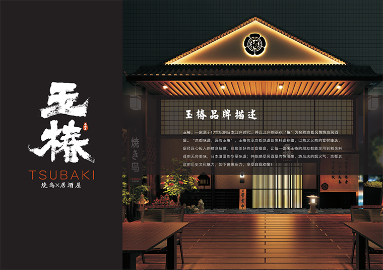 我們希望透過這個書法文字的LOGO標(biāo)識及輔助的家徽圖案塑造玉椿經(jīng)典的日式美學(xué)氣質(zhì)和料理文化底蘊。表達品牌傳承百年,初心如一的愿景,使之成為指引玉椿品牌前進的燈塔。玉椿燒鳥居酒屋,將“